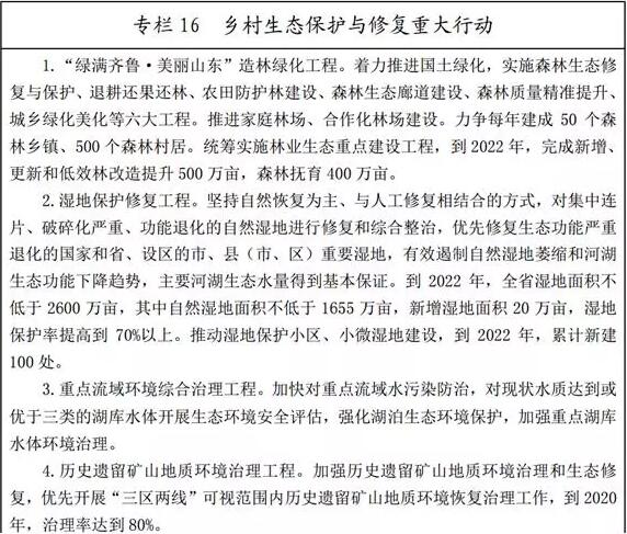 (二)實施生態(tài)修復重大工程。實施濕地修復工程,對集中連片、破碎化嚴重、功能退化的自然濕地進行修復和綜合整治,有效遏制自然濕地萎縮和河湖生態(tài)功能下降趨勢。開展沙化荒漠化治理,以東營、德州、聊城、濱州、菏澤五市為重點,積極推進喬灌結(jié)合的防風固沙林網(wǎng)、林帶、片林建設。推進荒山、荒溝、荒灘整治修復。積極推進泰山山水林田湖生態(tài)修復國家試點工程。支持長島海洋生態(tài)保護和持續(xù)發(fā)展。支持資源型城市開展生態(tài)修復工作,實施礦山環(huán)境治理恢復,持續(xù)推進采煤塌陷地治理。強化農(nóng)業(yè)防災減災能力建設,提高抵御洪澇災害、氣象災害等應急處置水平。