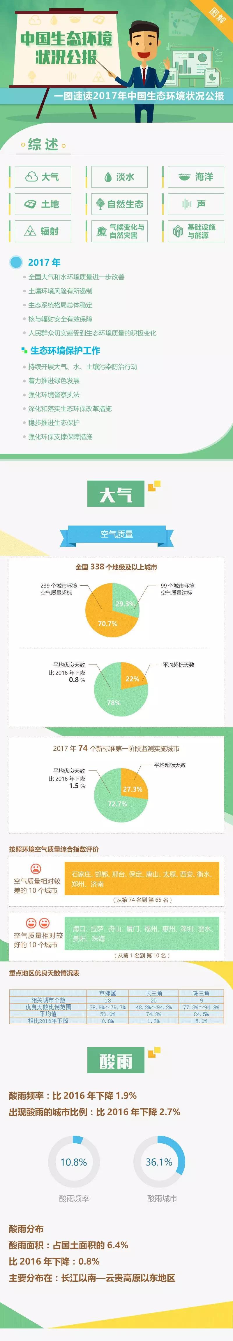 公報(bào)重點(diǎn)介紹2017年大氣、淡水、海洋、土地、自然生態(tài)、聲、輻射、氣候變化與自然災(zāi)害、基礎(chǔ)設(shè)施與能源狀況,綜述生態(tài)環(huán)境保護(hù)工作。公報(bào)顯示:
