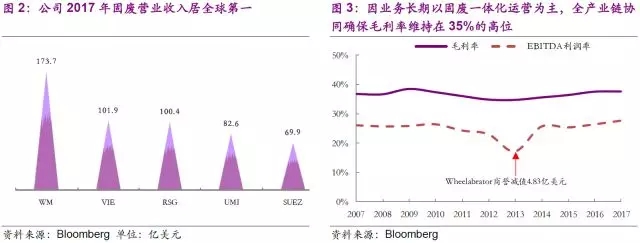 截止2018年5月23日,WM市值達(dá)357億美元。公司2017年垃圾處理量高達(dá)1.13億噸,實(shí)現(xiàn)營(yíng)業(yè)收入145億美元,EBIT和EBITDA分別為26和40億美元。公司2017年固廢營(yíng)業(yè)收入居全球第一,領(lǐng)先第二名威立雅達(dá)70%,而這一切都建立在公司僅在美國(guó)和加拿大運(yùn)營(yíng)的基礎(chǔ)上,充分展現(xiàn)出公司在固廢領(lǐng)域的絕對(duì)統(tǒng)治力。