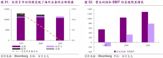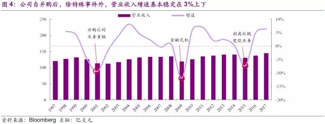 公司在1998年底合并后便堅(jiān)決的采用了收益導(dǎo)向策略來優(yōu)化公司業(yè)務(wù)結(jié)構(gòu),首當(dāng)其沖調(diào)整的便是海外業(yè)務(wù)。北美外業(yè)務(wù)是助力公司成為全球最大固廢公司的核心驅(qū)動(dòng)之一,為公司帶來了可觀的營(yíng)業(yè)收入。但是隨著競(jìng)爭(zhēng)的逐步加大,北美外業(yè)務(wù)的營(yíng)業(yè)利潤(rùn)逐步下滑。公司僅用2年時(shí)間便基本完成了海外業(yè)務(wù)的剝離,這一切還是發(fā)生在美國(guó)和加拿大營(yíng)業(yè)收入同步下滑的基礎(chǔ)上,可見公司的決心。更值得稱道的是,2年間公司營(yíng)業(yè)利潤(rùn)實(shí)現(xiàn)了明顯增長(zhǎng),股價(jià)也隨之走高,充分體現(xiàn)出了收益導(dǎo)向策略的成功之處。