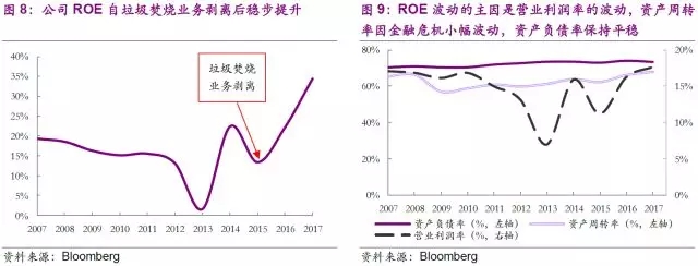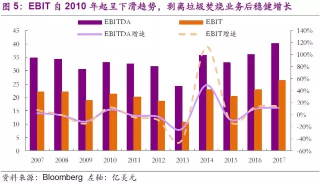 由于金融危機(jī)和垃圾焚燒電價(jià)下降等多重因素共同作用,公司ROE自2007年起逐步走低。隨著多個(gè)長(zhǎng)期垃圾焚燒發(fā)電合同的到期,公司需要重新按照市場(chǎng)價(jià)格續(xù)簽合同,經(jīng)過慎重評(píng)估后,公司在2013年確認(rèn)了高達(dá)4.83億美元的Wheelabrator公司商譽(yù)減值,在營(yíng)業(yè)收入略有增長(zhǎng)的情況下,將公司EBIT從2012年的18.5億美元直線拉低至10.8億美元,帶動(dòng)公司營(yíng)業(yè)利潤(rùn)率跌破10%,ROE也降到不足2%。雖然2014年Wheelabrator營(yíng)業(yè)收入有所增長(zhǎng),但是站在公司長(zhǎng)期戰(zhàn)略性角度考慮,垃圾焚燒業(yè)務(wù)已不再屬于公司核心業(yè)務(wù)。公司最終于2014年正式出售Wheelabrator子公司及其全部垃圾焚燒業(yè)務(wù)。經(jīng)過2015年的剝離陣痛后,公司營(yíng)業(yè)利潤(rùn)率和ROE重新回到歷史高位。