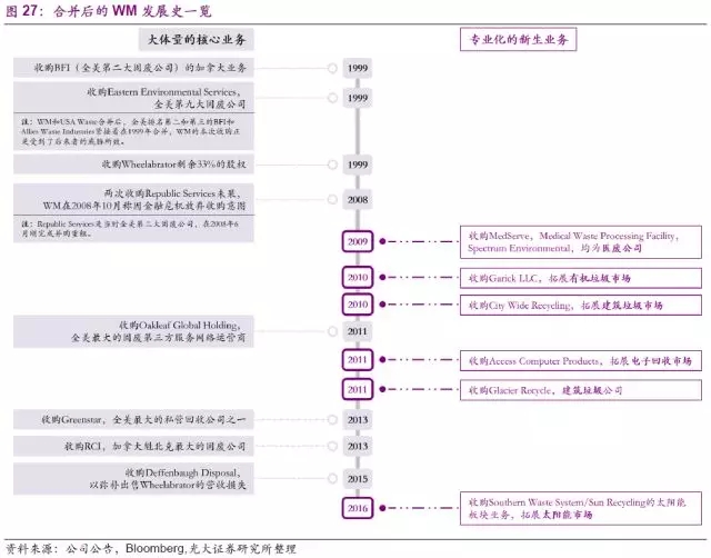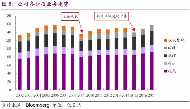 公司核心業(yè)務(wù)在美國(guó)已占據(jù)領(lǐng)先地位,合并后,公司先是迅速拿下了BFI(全美第二大固廢公司)的加拿大全部業(yè)務(wù),緊接著又收購了全美第九大固廢公司Eastern Environmental Services。公司在穩(wěn)固開展自有優(yōu)勢(shì)垃圾收運(yùn)業(yè)務(wù)的基礎(chǔ)上,先是在1999年收購公司垃圾焚燒領(lǐng)域支柱Wheelabrator的剩余33%股權(quán),隨后分別在2011年、2013年收購全美最大的固廢第三方服務(wù)運(yùn)營(yíng)商Oakleaf Global Holding和私營(yíng)回收公司Greenstar,穩(wěn)固提高公司在垃圾收運(yùn)、垃圾轉(zhuǎn)運(yùn)、以及垃圾回收等核心業(yè)務(wù)上的領(lǐng)先地位。