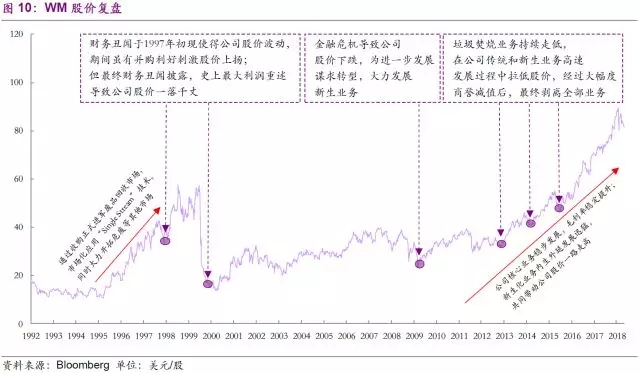 公司的發(fā)展之路并非一帆風(fēng)順。通過1970—1990年間的大肆并購擴(kuò)張,從傳統(tǒng)的收集轉(zhuǎn)運(yùn)領(lǐng)域拓展到回收、危廢等市場(chǎng),公司成功成為全球第一的固廢公司。但因擴(kuò)張過快、戰(zhàn)略不當(dāng)?shù)纫蛩?,公司?999年被市值和營(yíng)業(yè)收入遠(yuǎn)小于自己的USA Waste Services Inc并購,財(cái)務(wù)丑聞事件最終被披露也使得公司股價(jià)一落千丈。合并后的公司并沒有從此一蹶不振,而是通過不斷優(yōu)化公司經(jīng)營(yíng)策略,聚焦核心主業(yè)的同時(shí)大力發(fā)展新生化業(yè)務(wù),引領(lǐng)公司一路走高至目前的近400億美元市值。