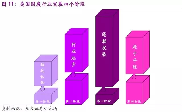 美國(guó)固廢行業(yè)伴隨著美國(guó)整體的經(jīng)濟(jì)的發(fā)展變化經(jīng)歷了“缺乏認(rèn)知”(兩次工業(yè)革命—1930s),“行業(yè)起步”(1930s—二戰(zhàn)結(jié)束),“蓬勃發(fā)展”(二戰(zhàn)結(jié)束—1980s)和“趨于平緩”(1980s—至今)的四個(gè)階段。經(jīng)過比較分析,我們認(rèn)為第三第四階段更貼合中國(guó)的實(shí)際并且可以發(fā)掘出參考意義,所以我們將著重描述“蓬勃發(fā)展”和“趨于平緩”兩個(gè)階段。