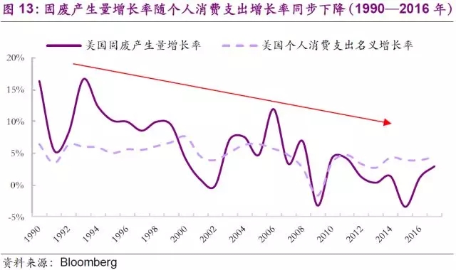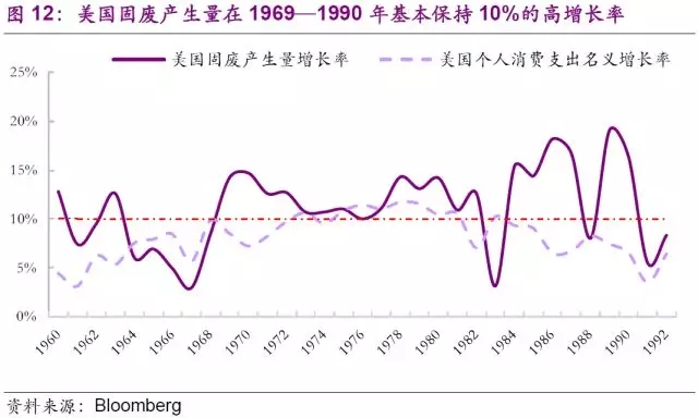 二戰(zhàn)后,美國(guó)新技術(shù)革命的推動(dòng)(主要原因)與國(guó)民經(jīng)濟(jì)的軍事化(越南戰(zhàn)爭(zhēng))極大地刺激了經(jīng)濟(jì)的增長(zhǎng)。利用戰(zhàn)后經(jīng)濟(jì)優(yōu)勢(shì)地位和國(guó)外廉價(jià)資源(石油等),美國(guó)的現(xiàn)代跨國(guó)公司大力拓展世界市場(chǎng),極大地獲取高額利潤(rùn),使得美國(guó)國(guó)內(nèi)經(jīng)濟(jì)持續(xù)發(fā)展,西部和南部呈現(xiàn)繁榮之象并且造就了一個(gè)黃金時(shí)代。高速發(fā)展的黃金時(shí)期,美國(guó)居民生活水平持續(xù)提高,個(gè)人消費(fèi)增速明顯,進(jìn)而帶動(dòng)固廢量持續(xù)走高,這段時(shí)期也是固廢行業(yè)蓬勃發(fā)展的第三階段。