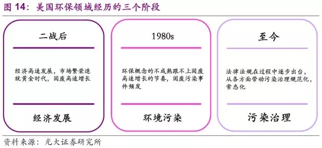 和其他發(fā)達(dá)國(guó)家一樣,美國(guó)在環(huán)保領(lǐng)域同樣經(jīng)歷了“經(jīng)濟(jì)發(fā)展—環(huán)境污染—污染治理”這一過程,而這三者之間的脈絡(luò)基本對(duì)應(yīng)固廢行業(yè)的第三,四階段。在這兩個(gè)階段之前美國(guó)出臺(tái)的一系列法規(guī),先后幫助固廢行業(yè)的完善成長(zhǎng)以及促使其朝著平穩(wěn)可持續(xù)健康的發(fā)展業(yè)態(tài)前進(jìn)。