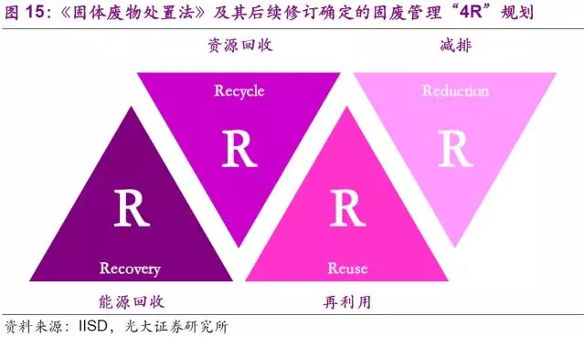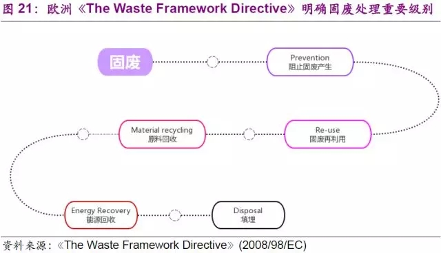 如果分析中國(guó)、美國(guó)、日本/西歐在固廢行業(yè)的發(fā)展,基本是逐漸完善固廢最大化利用產(chǎn)業(yè)鏈的過程。中國(guó)的垃圾填埋和垃圾焚燒技術(shù)已經(jīng)相對(duì)成熟,國(guó)家在《“十三五”全國(guó)城鎮(zhèn)生活垃圾無害化處理設(shè)施建設(shè)規(guī)劃》中也規(guī)定了2020年城市垃圾無害化處理達(dá)到100%的指標(biāo)要求。但是在處置前端的垃圾分類,以及后端的回收利用,中國(guó)距發(fā)達(dá)國(guó)家仍有較大的差距。美國(guó)擁有完善的固廢收運(yùn)和處理系統(tǒng),但是由于前端垃圾分類的不徹底,導(dǎo)致后端回收利用率受限。日本/西歐則是目前行業(yè)發(fā)展金字塔的頂端。兩個(gè)地區(qū)擁有完善的前端垃圾分類和收運(yùn)轉(zhuǎn)運(yùn)體系,垃圾焚燒和循環(huán)再造業(yè)務(wù)則是兩個(gè)地區(qū)后端處置的不同特色。