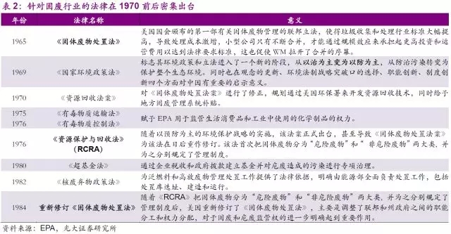 雖然以上法律法規(guī)的頒布和公司所處的固廢行業(yè)并無太大的關(guān)聯(lián),但這段時(shí)期環(huán)保領(lǐng)域法律法規(guī)的密集出臺(tái),拉開了美國(guó)政府正式通過行政干預(yù)環(huán)境治理以及扶持環(huán)保產(chǎn)業(yè)崛起的序幕,對(duì)固廢行業(yè)的發(fā)展打下了堅(jiān)實(shí)的基礎(chǔ)。