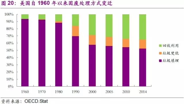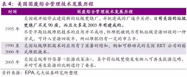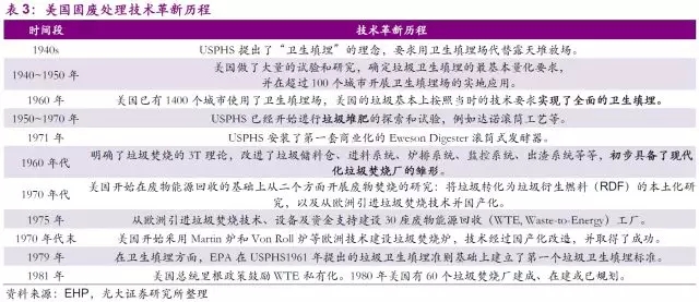 固廢行業(yè)的技術(shù)發(fā)展同樣是制約市場(chǎng)和公司發(fā)展的另一個(gè)決定性因素。早在1940年,美國(guó)公共衛(wèi)生署(USPHS)便開始推行了一系列固廢處置的技術(shù)性試驗(yàn),從“衛(wèi)生填埋代替露天堆放”,到“垃圾堆肥的探索和試驗(yàn)”,再到“垃圾焚燒”,最后到了如今大力推廣的“廢物能源回收”的綜合利用。