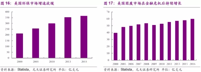 隨著環(huán)保處置設(shè)施要求的日益提升,環(huán)保市場(chǎng)也在穩(wěn)步擴(kuò)大。美國(guó)環(huán)保市場(chǎng)從2000年的2090億美元發(fā)展到2015年的3631億美元,但增速近年來有所放緩。固廢市場(chǎng)在2009年受金融危機(jī)影響有所下滑后,重回增長(zhǎng)軌道。