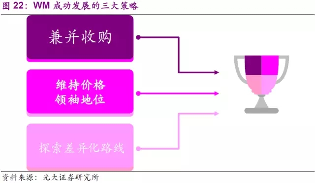 縱觀WM發(fā)展的歷史,它既享受到外部經(jīng)濟(jì)和行業(yè)高速發(fā)展所帶來的廣闊市場(chǎng),也需經(jīng)歷經(jīng)濟(jì)危機(jī)和市場(chǎng)轉(zhuǎn)型所帶來的陣痛。公司為搶占市場(chǎng)份額,穩(wěn)固龍頭地位,實(shí)現(xiàn)股東最大化方面做出了多方面努力,制定了各類執(zhí)行策略以期達(dá)到目標(biāo),而我們認(rèn)為其中最重要的是三項(xiàng)策略,也是我們將進(jìn)一步細(xì)致分析的,即兼并收購,維持價(jià)格領(lǐng)袖地位,以及探索差異化路線。