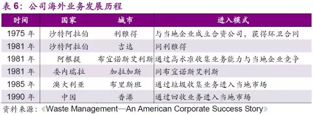 在美國(guó)成功擴(kuò)張的同時(shí),WMI也抓住了在國(guó)際市場(chǎng)上發(fā)展的機(jī)遇。1975年,公司通過與當(dāng)?shù)仄髽I(yè)成立合資公司的方式,成功的打開了沙特首都利雅得的環(huán)衛(wèi)市場(chǎng),這也是世界上第一個(gè)跨國(guó)的環(huán)衛(wèi)合同。這個(gè)合同的示范效應(yīng)給了WMI世界范圍的關(guān)注。1980年,公司先后成功進(jìn)入了阿根廷、委內(nèi)瑞拉、澳大利亞、部分歐洲國(guó)家,以及香港的危廢及環(huán)衛(wèi)市場(chǎng),并于1990年成為了世界最大的固廢龍頭。