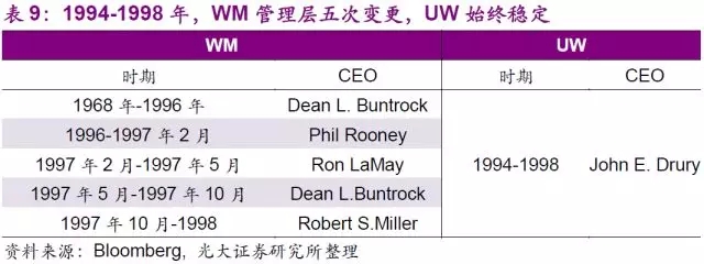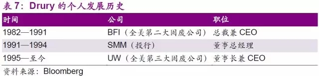 值得一提的是UW高速發(fā)展的源動(dòng)力,公司CEO John E.Drury。作為Browning-Ferris Industries(以下簡(jiǎn)稱“BFI”)的總裁兼COO,Drury用了10年時(shí)間引領(lǐng)BFI成為全美第二大固廢公司的位置,然而因?yàn)椴唤邮芄綜EO大力發(fā)展垃圾回收行業(yè)的決定,離開公司并于1994年擔(dān)任UW的CEO。Drury僅花了3年時(shí)間,通過1995年的5次大型收購,以及1996年的30次小型收購,將公司的營(yíng)業(yè)收入從1994年的434萬美元大幅增長(zhǎng)至1997年的26億美元,增速高達(dá)598倍。