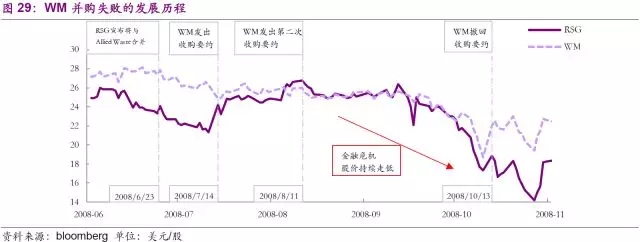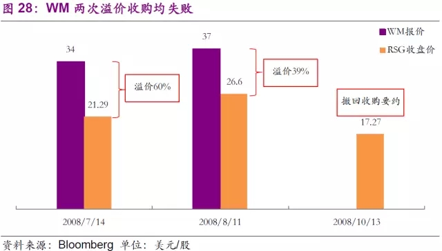 值得注意的是公司發(fā)起收購的時(shí)間。2008年6月23日,RSG宣布將與Allied Waste合并,而當(dāng)時(shí)Allied Waste和RSG分別是美國(guó)第二、第三大固廢公司。消息宣布后一個(gè)月內(nèi),WM就向RSG提出了收購要約,但未能實(shí)現(xiàn)。