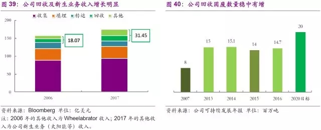 隨著固廢傳統(tǒng)市場(chǎng)業(yè)務(wù)趨于飽和,公司也在積極求變。一方面,公司利用自有團(tuán)隊(duì)積極研發(fā)已有業(yè)務(wù)的轉(zhuǎn)型,另一方面,公司先后在2009至2016年,通過多次收購成熟的專業(yè)化新生公司,拓展了醫(yī)廢、有機(jī)垃圾、建筑垃圾、電子回收等市場(chǎng),并取得了一定成績(jī)。需要注意的是,公司的以上收購雖涉及不同細(xì)分領(lǐng)域,但核心觀念一致,即加大資源回收再利用,這也契合美國(guó)固廢市場(chǎng)的轉(zhuǎn)型,進(jìn)一步優(yōu)化完善固廢處理全產(chǎn)業(yè)鏈發(fā)展。