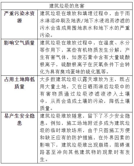 我國絕大部分建筑垃圾未經(jīng)任何處理便被運(yùn)往郊外露天堆放或填埋,既占用大量土地,又容易在清運(yùn)和堆放過程中的遺撒粉塵、灰砂飛揚(yáng)等問題,進(jìn)而造成嚴(yán)重的環(huán)境污染。