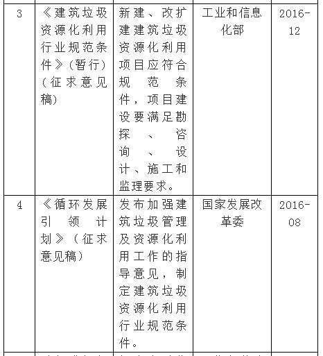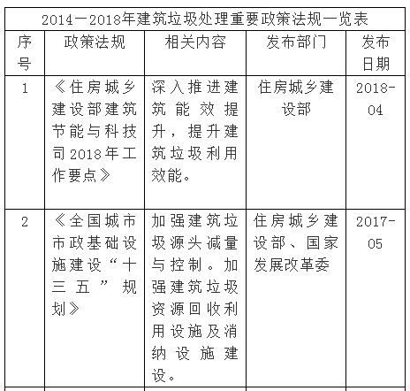 長期以來,由于缺乏統(tǒng)一完善的建筑垃圾管理辦法和良好的產(chǎn)業(yè)扶持政策致使建筑垃圾絕大部分未經(jīng)任何處理便被露天堆放或簡易填埋,如何處理和利用建筑垃圾,已經(jīng)成為政府所面臨的一個重要難題。為了解決建筑垃圾處理難題,促進(jìn)建筑垃圾循環(huán)利用,國家近幾年頒布了一系列的政策法規(guī),具體政策如下: