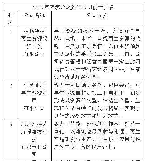 根據(jù)《中國報告大廳網(wǎng)》匯總信息得知,截至2017年底,通過對建筑垃圾處理行業(yè)各項(xiàng)數(shù)據(jù)統(tǒng)計,建筑垃圾處理公司排名前十的分別是清遠(yuǎn)華清、江蘇黃埔、元泰達(dá)、天實(shí)偉創(chuàng)、上海山美、德濱環(huán)保、鼎盛工程、凱興礦山、一帆機(jī)械、黎明重工,詳細(xì)情況介紹如下: