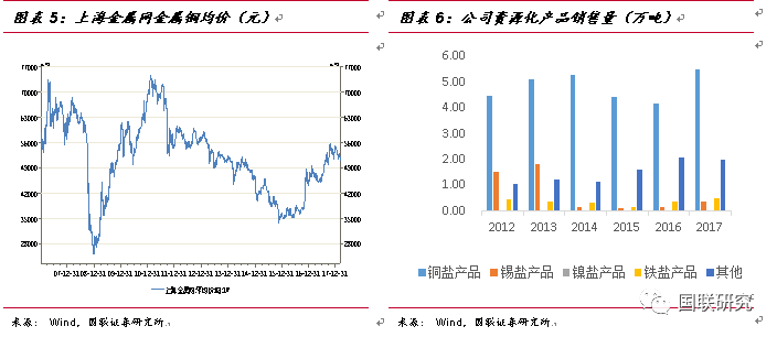 公司工業(yè)廢物資源化利用業(yè)務亦為公司重要主營業(yè)務之一。由于資源化業(yè)務不僅受到產能和產品銷量影響,還與大宗商品的價格波動息息相關。公司資源化產品主要包括銅鹽、錫鹽、鎳鹽和鐵鹽產品等。2016年前,受到國際基本金屬價格下跌、行業(yè)競爭加劇的影響,公司資源化業(yè)務營收略有下降。2012至2016年,公司資源化業(yè)務營收由9.39億元降低至7.91億元,毛利率維持在30%左右,而2017年,公司資源化業(yè)務營收11.82億,同比增長49.33%,主要是因為各基地資源化產銷量增加、重金屬價格上升、加之公司加大海外銷售等。