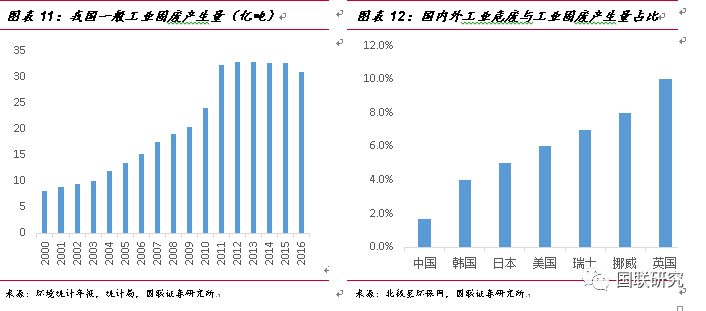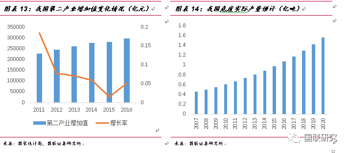 ②第二產業(yè)增加值測算法:由于危廢排放的企業(yè)多數(shù)來自于化工、有色等中游制造企業(yè),我們認為危廢的實際產生量將與第二產業(yè)的景氣度是呈現(xiàn)正相關性。2007年至2016年,我國第二產業(yè)的增加值由11.58萬億元增長到29.65萬億元,復合增長率達9.91%,2007年污染源第一次普查時危廢實際產量為4573萬噸,在默認普查數(shù)據(jù)為準確數(shù)據(jù)的情況下,按照9.91%的危廢增長速率進行測算,2016年我國危廢實際產生量將達到1.07億噸。