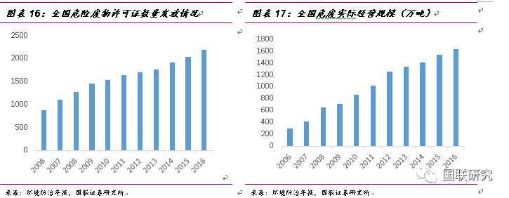 在一系列環(huán)保政策的刺激下,危廢處置行業(yè)需求將逐步迎來有效釋放。根據(jù)《2017年全國大、中城市固體廢物污染環(huán)境防治年報》統(tǒng)計數(shù)據(jù)顯示,截至2016年底,全國各省(區(qū)、市)頒發(fā)的危廢(包含醫(yī)療廢物)經營許可證共計2195份,核準經營規(guī)模為6471萬噸/年(含收集經營規(guī)模397萬噸/年)。而根據(jù)環(huán)境防治年報,2016年實際經營規(guī)模為1629萬噸(含收集23萬噸),有效處理能力較低,大量的產能仍未完全釋放。