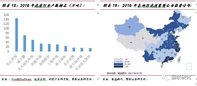 行業(yè)集中度低、規(guī)模小,公司處于絕對領先地位。我國的危廢行業(yè)的市場參與者眾多,但是具有規(guī)模效應的企業(yè)很少,目前我國危廢行業(yè)呈現(xiàn)出的特征主要有以下幾點:①行業(yè)集中度低:根據(jù)Frost&Sullivan、遠卓分析、前瞻產業(yè)研究院的統(tǒng)計數(shù)據(jù),截止 2016 年,行業(yè)內排名前十大公司僅占總設計處置能力的6.8%,其中東江環(huán)保市占率為2.26%,處絕對領先地位;②危險廢物產生量與處理能力分布不匹配。2016年我國持危險廢棄物經營許可證的企業(yè)數(shù)量為2149家,主要集中于長三角和珠三角區(qū)域,欠發(fā)達地區(qū)許可證數(shù)量少。其中江蘇、浙江和廣東三省資質企業(yè)數(shù)量共計503家,占全國總數(shù)的30%以上。根據(jù)Frost&Sullivan的數(shù)據(jù),2015年危險廢物產生量主要集中在東部、西北部、中部,分別占總產生量的31%、24%,13%,可以看出華東地區(qū)及西北地區(qū)占危險廢物產生量的大部分。而經濟發(fā)達地區(qū)如華東及華南占危險廢物處理能力的大部分。危廢處置行業(yè)中,東江環(huán)保、光大國際、威立雅中國、新宇國際等企業(yè)進入行業(yè)較早,經過多年的發(fā)展已經具備規(guī)模和產能優(yōu)勢,而且位于危廢產生量較大的省份,有較強的客戶資源和競爭優(yōu)勢。③經營企業(yè)規(guī)模小、處理能力弱。按照2016年核準經營規(guī)模和企業(yè)數(shù)量的數(shù)據(jù)測算,平均每家的核準處理能力僅為3萬噸/年,并且大部分企業(yè)技術、資金等實力較弱,日均處理能力超過50噸的企業(yè)占比不到20%,達到1000噸的僅占0.3%,并且能夠處理25種以上危廢種類的企業(yè)僅為1%,絕大多數(shù)均小于10種。在2017年,東江環(huán)保已具備44類危險廢物經營資質,在危廢行業(yè)中處于絕對領先地位。
