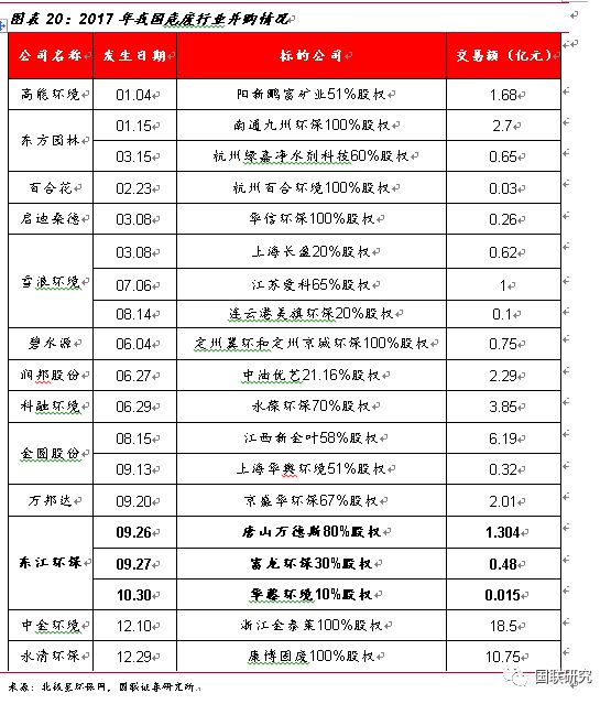 行業(yè)并購熱度高,進入群雄逐鹿時代。在過去的2017年,我國危廢行業(yè)兼并購市場火爆,整個環(huán)保產業(yè)共發(fā)生86起并購,交易金額達385億元,交易金額與數(shù)量均創(chuàng)新高,其中涉及到危廢的并購市場達20余起。