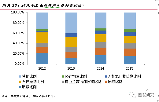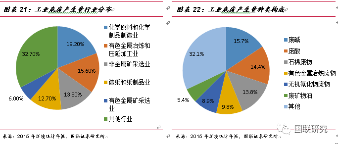 工業(yè)危廢的主要來源及種類構成。鑒于對危險廢物的認識不斷深入,在2016年6月21日,生態(tài)環(huán)境部重新修訂了《國家危險廢物名錄》,將危廢由49大類重新調整為46大類,新增117種類別,共計479種,而其中70%以上的危廢都來自于工業(yè)行業(yè)。據(jù)2015年環(huán)境統(tǒng)計年報數(shù)據(jù)統(tǒng)計,工業(yè)危廢中產量最大的行業(yè)分別為化學原料與化學制品制造業(yè)(占比19.2%)、有色金屬冶煉和壓延加工(占比15.6%)、非金屬礦采選業(yè)(占比13.8%)以及造紙和紙制品業(yè)(占比12.7%)。