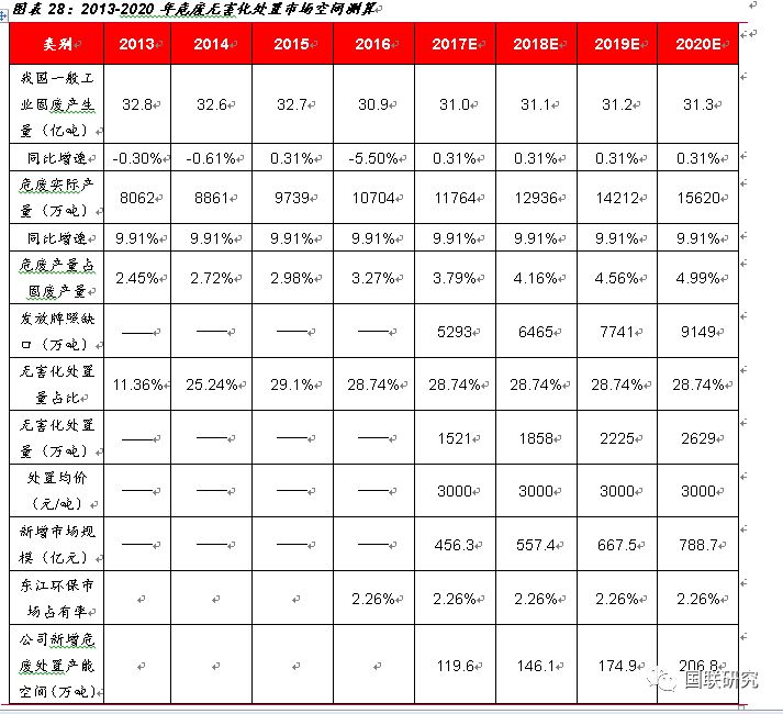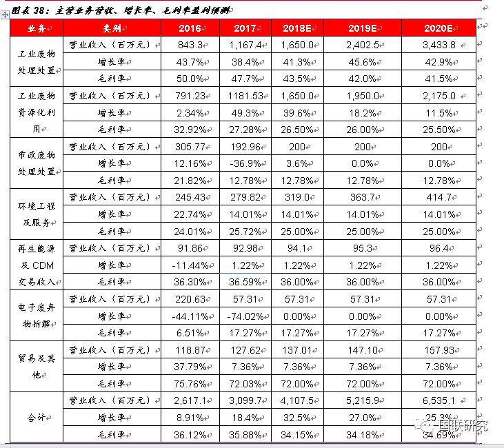 1.河北衡水睿韜項目(無害化)、江西固廢二期(資源化)、福建南平(無害化)、山東濰坊東江(無害化+資源化)、湖北仙桃綠怡(資源化)、江蘇南通(無害化)、泉州PPP項目(無害化+資源化)項目于2018年建成并投產使用。2018-2020年無害化產能分別為110萬噸、155萬噸、205萬噸。2.考慮到后期有部分項目進行技術升級改造,以及公司正在加大物化業(yè)務市場拓展和資質匹配,2018-2020年產能利用率按照60%、62%、65%進行測算。3.由于目前危廢處置仍然存在較大的供需缺口,暫不考慮價格因素對公司收入的影響,無害化處置價格2018-2020年全部按照2500元/噸進行預測。4.由于自2016年10月開始大宗商品價格有所回暖,近期趨于穩(wěn)定,根據(jù)上海金屬網價格顯示,金屬銅2016-2017年均價上漲28%,預計2017-2020年資源化產品價格增幅分別為14%、0%、0%、0%,均價全部按照1500元/噸進行計算,2018-2020年資源化產能按照110萬噸、130萬噸、145萬噸計算。5.保守起見,暫不考慮參股海螺創(chuàng)業(yè)帶來的收入影響。