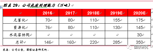 公司始終專注于危險廢物的無害化處理及資源化利用,憑借自身突出的技術優(yōu)勢、資深的管理經驗以及資本優(yōu)勢等,公司在危廢處理行業(yè)持續(xù)鞏固龍頭運營商的地位。截至2017年,公司擁有工業(yè)危險廢物處理資質達160萬噸/年,在行業(yè)內遙遙領先。按照公司未來幾年規(guī)劃產能,2020年預計公司將擁有350萬噸/年的綜合治理產能,包括水泥窯協(xié)同處置產能,CAGR達29.81%。對比我們上文對公司未來產能空間的測算,假設市占率2.26%保持不變,公司預期產能352.8萬噸,所以我們判斷公司規(guī)劃的產能實現(xiàn)概率很高。