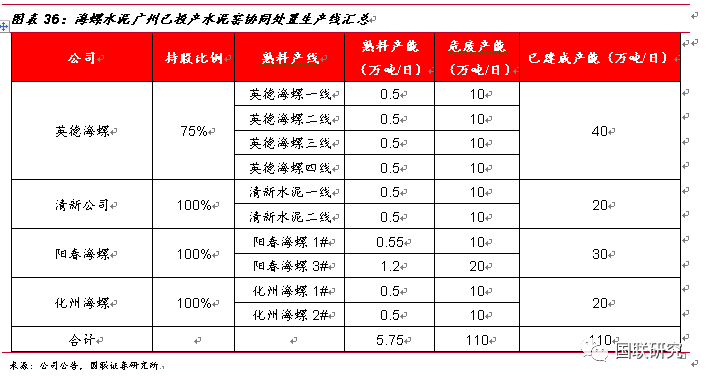 以廣東省為試點,公司攜手海螺創(chuàng)業(yè)深耕危廢領域。公司與海螺創(chuàng)業(yè)將以包括但不限于股權合作的方式進行廣東省水泥窯協(xié)同處置固廢布點,包括但不限于以《廣東省環(huán)境保護“十三五”規(guī)劃》和《廣東省水泥行業(yè)轉型升級技術路線和行動計劃(2016-2018年)》為指導。根據(jù)“十三五”期間規(guī)劃要求,廣東省水泥窯協(xié)同處置危廢產能為500萬噸/年,據(jù)海螺水泥公司公告統(tǒng)計,其在廣東省內共計有4家子公司,分別為英德海螺、清新水泥、化州海螺以及陽春海螺,共計10條投產線,已建成熟料產能分別為2萬噸/日、1萬噸/日、1萬噸/日以及1.75萬噸/日,若全部完成協(xié)同改造,危廢產能總計將達110萬噸/年。