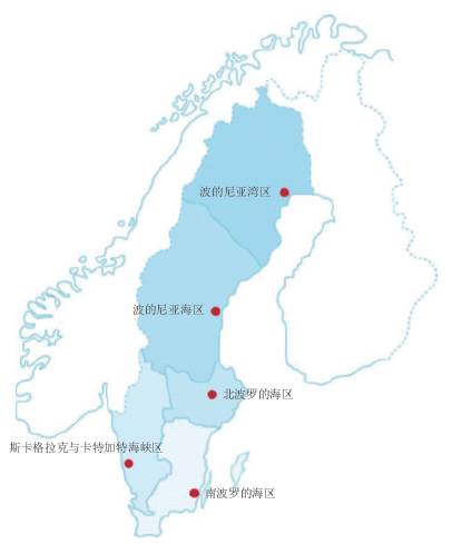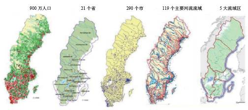 2000年,《歐盟水框架指令》開始實(shí)施,歐盟各成員國的水資源管理工作的開展更協(xié)調(diào)、更統(tǒng)一。自2004年起,為了更有效地管理水環(huán)境,瑞典被劃分為五大水資源區(qū)(如圖1、2所示),每個(gè)區(qū)包含多個(gè)江河流域。瑞典總共有119個(gè)主要的江河流域,這些流域是地方水資源管理工作的起點(diǎn)。這五大水資源區(qū)是按照它們與海床的地理區(qū)域關(guān)系劃分的,這些海床包括:波的尼亞灣區(qū)、波的尼亞海區(qū)、北波羅的海區(qū)、南波羅的海區(qū)、斯卡格拉克與卡特加特海峽區(qū)等。此后瑞典在五大水資源區(qū)開展水資源管理工作。