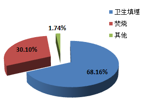 目前,我國(guó)城市生活垃圾無(wú)害化處理方式包括:衛(wèi)生填埋、高溫堆肥和焚燒,圖1為2014年我國(guó)垃圾處理方式比例,顯示我國(guó)仍然以填埋為主[2]。但焚燒憑借其減量效果最明顯、無(wú)害化最徹底、且焚燒熱量可以有效利用的特點(diǎn),近年來(lái)比例上升很快,可以預(yù)見,焚燒正逐步成為處理城市垃圾的最主要方式。