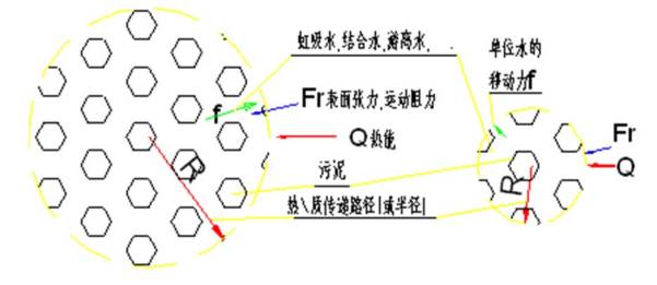 對(duì)于同一質(zhì)量的水分子而言,遷移運(yùn)動(dòng)消耗的動(dòng)能就是其移動(dòng)阻力(f)和路徑(R)的 正函數(shù)值,隨著移動(dòng)路徑(R)的增加而明顯增大,這些動(dòng)能在干燥過(guò)程中都是由熱能轉(zhuǎn)變 而來(lái)的。因此,在同一物料工況表面張力(Fr)恒定的情況下,路徑(R)越大,附帶(除 水分汽化的)消耗的熱能越高。