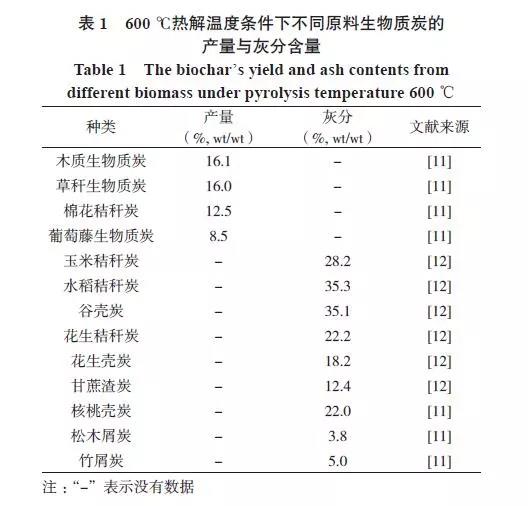 同樣的熱解溫度條件下,不同的炭化材料制備的生物質(zhì)炭性質(zhì)不同。600 ℃條件制備的木質(zhì)生物質(zhì)炭、草稈生物質(zhì)炭、棉花秸稈生物質(zhì)炭和葡萄藤生物質(zhì)炭產(chǎn)量相比,木質(zhì)生物質(zhì)炭和草稈生物質(zhì)炭的產(chǎn)量16.1%(wt/wt)較高,而葡萄藤生物質(zhì)炭的產(chǎn)量8.5%(wt/wt)較低(表1)。生物質(zhì)炭的產(chǎn)量指風干生物質(zhì)熱解炭化后的干重,主要與生物質(zhì)中的纖維素和木質(zhì)素含量有關。同樣的溫度條件下,不同來源生物質(zhì)炭的灰分含量變化較大,秸稈類生物質(zhì)炭的灰分含量較高22.2%~35.1%(wt/wt),而木炭和竹炭的灰分含量較低3.8%~5.0% (wt/wt)。一般來說,木本科的生物質(zhì)炭含碳量較高,礦質(zhì)養(yǎng)分較少;畜禽糞便和草本植物生產(chǎn)的生物質(zhì)炭含碳量較低,礦質(zhì)元素含量較高。