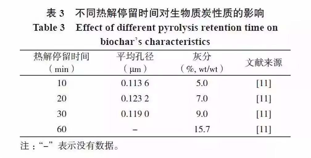 生物質(zhì)炭具有復雜的孔隙結(jié)構(gòu),其孔徑大小決定其比表面積。而生物質(zhì)炭的孔徑大小與熱解停留時間也有關系。當熱解停留時間為20~30 min 時,生物質(zhì)炭的平均孔徑相對于停留時間10 min 時的孔徑尺寸提高了4.8%~8.5%(表3)?;曳趾恳矔S著熱解停留時間的延長而增加。Tan 等分析結(jié)果表明熱解停留時間為20 min,生物質(zhì)炭的灰分含量為7.0% ;停留時間為60 min,其灰分含量增加至15.7%。這是由于熱解停留時間長,易于有機物質(zhì)揮發(fā)而殘留更多的灰分。