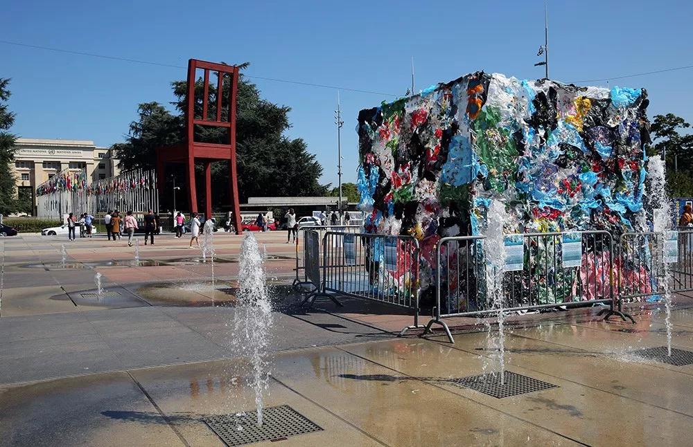配圖:工作組會(huì)議期間,日內(nèi)瓦萬國宮外的塑料垃圾“立方”,提醒人們塑料垃圾問題的嚴(yán)重性。