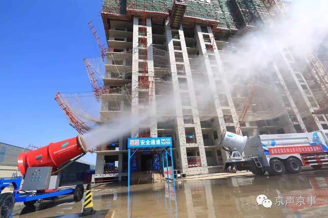 2016年,北京朝陽區(qū)用抑塵射霧器治理工地揚塵,這個多功能抑塵射霧器是“藍天計劃”引入的新技術之一。攝影人民日報記者王昊男
