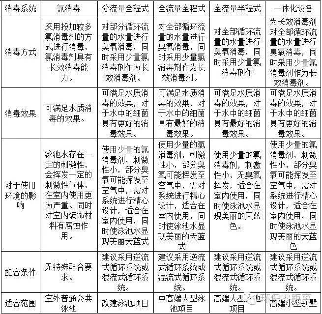 游泳池水處理系統(tǒng)的一個(gè)重要組成部分是消毒系統(tǒng),常用的消毒系統(tǒng)有氯消毒系統(tǒng)、臭氧消毒系統(tǒng)等。其中臭氧消毒系統(tǒng)從消毒量來(lái)分有全流量臭氧消毒系統(tǒng)和分流量臭氧消毒系統(tǒng)兩大系列;從消毒流程來(lái)分有全程式及半程式兩種;同時(shí),為了適應(yīng)新的發(fā)展,目前出現(xiàn)了一種一體化臭氧消毒設(shè)備。這些消毒系統(tǒng)的特點(diǎn)具體見下表: