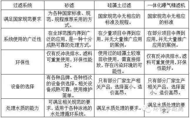 泳池過(guò)濾系統(tǒng)為循環(huán)處理系統(tǒng)的重要組成部分,該系統(tǒng)的選擇直接影響著游泳池水處理系統(tǒng)是否滿足使用要求?,F(xiàn)在的過(guò)濾系統(tǒng)有砂濾、硅藻土過(guò)濾、一體化曝氣精濾機(jī)等,他們各有特點(diǎn),具體的分析見下表。