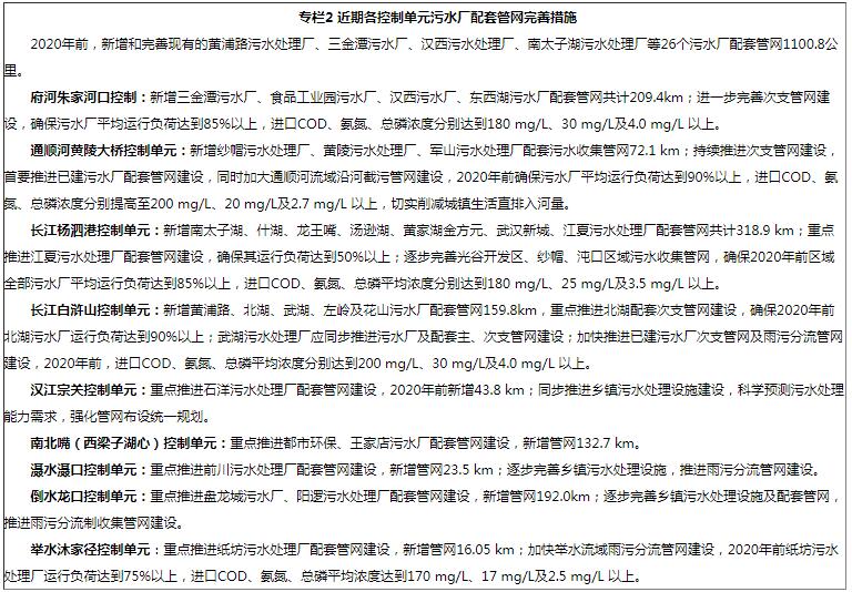 加快城鎮(zhèn)污水處理設(shè)施提標(biāo)改造。梁子湖、斧頭湖等敏感區(qū)域內(nèi)的現(xiàn)有城鎮(zhèn)污水處理設(shè)施2016年底前達(dá)到一級A排放標(biāo)準(zhǔn);新建城鎮(zhèn)污水處理設(shè)施執(zhí)行一級A排放標(biāo)準(zhǔn),現(xiàn)有處理設(shè)施需強化脫氮除磷工藝,逐步達(dá)到一級A排放標(biāo)準(zhǔn)。2020年前,灄水灄口控制單元、倒水龍口控制單元、舉水沐家徑控制單元、長江白滸山控制單元、長江楊泗港控制單元等重點區(qū)域內(nèi)污水廠應(yīng)完成提標(biāo)改造,出水達(dá)到一級A排放標(biāo)準(zhǔn);2035年前,研究基于水環(huán)境質(zhì)量目標(biāo)的城鎮(zhèn)生活污水廠出水排放指標(biāo)及要求,完成全市城鎮(zhèn)污水處理廠達(dá)標(biāo)改造工程。