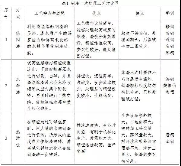 鋼渣的一次處理是把熱熔渣處理成粒徑符合一定要求的常溫塊渣,以有利于鋼渣的二次處理。目前國內(nèi)鋼渣一次處理主要工藝有:熱潑法、風淬法、滾筒法、?;喎?、熱悶法等,其中熱潑法、滾筒法、熱悶法最為常用。表1綜合比較了各種工藝的特點。