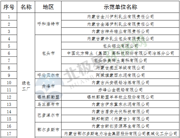 為貫徹落實(shí)《中國(guó)制造2025》,深入實(shí)施綠色制造工程,發(fā)揮綠色制造先進(jìn)典型的示范帶動(dòng)作用。按照《內(nèi)蒙古自治區(qū)綠色制造體系建設(shè)實(shí)施方案》要求,經(jīng)企業(yè)、園區(qū)自愿申報(bào),盟市經(jīng)信委初審?fù)扑],第三方機(jī)構(gòu)組織專家綜合評(píng)價(jià),現(xiàn)將符合綠色工廠、綠色園區(qū)、綠色供應(yīng)鏈條件的示范單位予以公布(見(jiàn)附件),并提出有關(guān)要求如下: