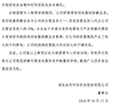 10月17日,金科環(huán)保發(fā)布公告稱,公司主營(yíng)業(yè)務(wù)廢舊電器拆解業(yè)務(wù)因未通過(guò)2018 年第二批次廢棄電器電子產(chǎn)品拆解處理技術(shù)復(fù)核,已暫停工作,該業(yè)務(wù)營(yíng)收約占公司主營(yíng)業(yè)務(wù)營(yíng)收的70%,預(yù)計(jì)將對(duì)金科環(huán)保的經(jīng)營(yíng)情況產(chǎn)生較大的不利影響。
