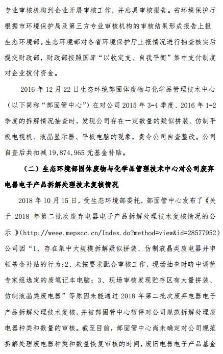 公告顯示,金科環(huán)保廢舊電器拆解業(yè)務(wù)未通過(guò)審核的原因在于:1、存在集中大規(guī)模拆解疑似拼裝、仿制液晶類廢電器并申領(lǐng)基金補(bǔ)貼的行為;2、未按要求配合審核工作,現(xiàn)場(chǎng)抽查時(shí)暗中調(diào)筐專家組選定的廢筆記本電腦;3、現(xiàn)場(chǎng)審核發(fā)現(xiàn)貯存區(qū)有大量拼裝、仿制液晶類廢電器。