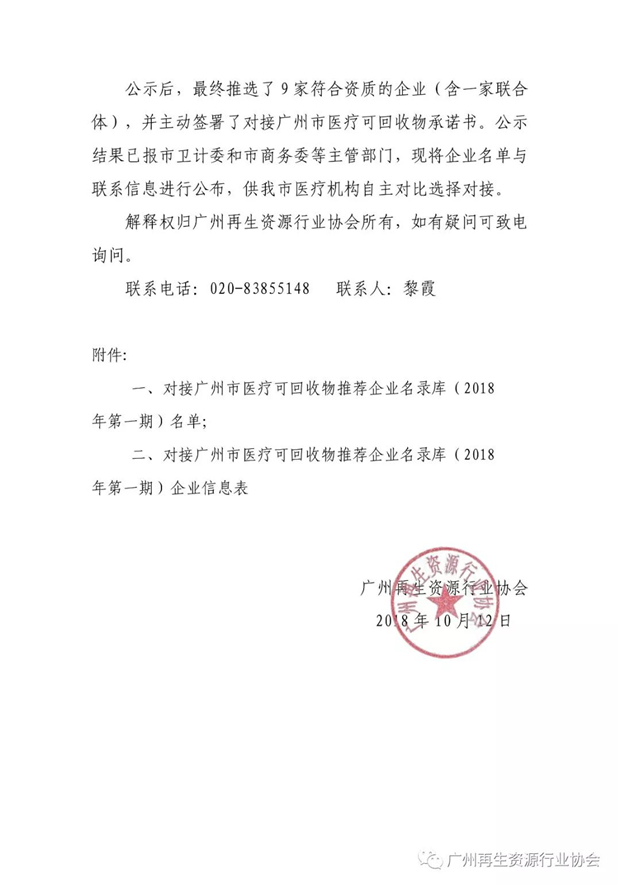 公示后,最終推選了9家符合資質(zhì)的企業(yè)(含一家聯(lián)合體),并主動(dòng)簽署了對(duì)接廣州市醫(yī)療可回收物承諾書。公示結(jié)果已報(bào)市衛(wèi)計(jì)委和市商務(wù)委等主管部門,現(xiàn)將企業(yè)名單與聯(lián)系信息進(jìn)行公布,供我市醫(yī)療機(jī)構(gòu)自主對(duì)比選擇對(duì)接。