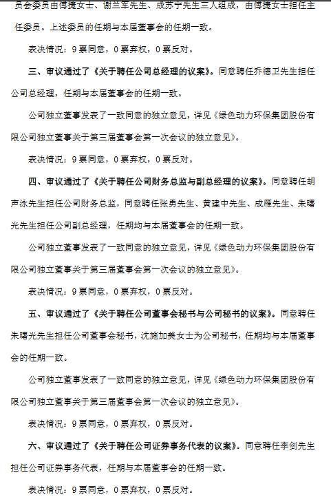 綠色動力環(huán)保發(fā)布公告,公司董事會審議通過了《關(guān)于選舉公司第三屆董事會董事長的議案》。選舉董事直軍擔(dān)任公司第三屆董事會董事長;審議通過了《關(guān)于聘任公司總經(jīng)理的議案》。同意聘任喬德衛(wèi)擔(dān)任公司總經(jīng)理;審議通過了《關(guān)于聘任公司財務(wù)總監(jiān)與副總經(jīng)理的議案》。同意聘任胡聲泳擔(dān)任公司財務(wù)總監(jiān),同意聘任張勇、黃建中、成雁、朱曙光擔(dān)任公司副總經(jīng)理。