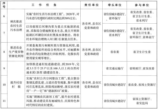 (一)加強(qiáng)組織領(lǐng)導(dǎo)。各級黨委和政府要把農(nóng)村人居環(huán)境整治作為實(shí)施鄉(xiāng)村振興戰(zhàn)略的重要任務(wù)。省農(nóng)委具體負(fù)責(zé)工作協(xié)調(diào)、組織推動和督導(dǎo)考核,負(fù)責(zé)農(nóng)業(yè)生產(chǎn)廢棄物污染治理和村容村貌提升等工作。省財(cái)政廳要根據(jù)農(nóng)村人居環(huán)境整治任務(wù)的資金需求,做好資金籌措工作。省發(fā)改委要做好項(xiàng)目統(tǒng)籌,爭取中央預(yù)算內(nèi)資金支持。省住房城鄉(xiāng)建設(shè)廳負(fù)責(zé)農(nóng)村生活垃圾污水治理、農(nóng)村廁所革命、農(nóng)村黑臭水體整治和農(nóng)房建設(shè)管理等工作。省水利廳負(fù)責(zé)清淤疏浚等工作。省環(huán)保廳負(fù)責(zé)農(nóng)村環(huán)境綜合整治全省域覆蓋工作。省交通運(yùn)輸廳負(fù)責(zé)農(nóng)村道路建設(shè)工作。其他相關(guān)部門參照國家部委有關(guān)工作職責(zé)分工,做好全省農(nóng)村人居環(huán)境整治相關(guān)工作的落實(shí)推進(jìn)。市州黨委和政府做好上下銜接、域內(nèi)協(xié)調(diào)和督促檢查工作。縣級黨委和政府是農(nóng)村人居環(huán)境整治的責(zé)任主體,黨政主要負(fù)責(zé)同志負(fù)主體責(zé)任,要做好項(xiàng)目落地、資金使用、推進(jìn)實(shí)施等工作,對實(shí)施效果負(fù)責(zé)。鄉(xiāng)鎮(zhèn)黨委和政府要做好具體組織實(shí)施工作。村委會、作業(yè)區(qū)(生產(chǎn)隊(duì))負(fù)責(zé)動員黨員干部和村民完善村規(guī)民約,發(fā)動群眾投工投勞開展農(nóng)村人居環(huán)境整治。