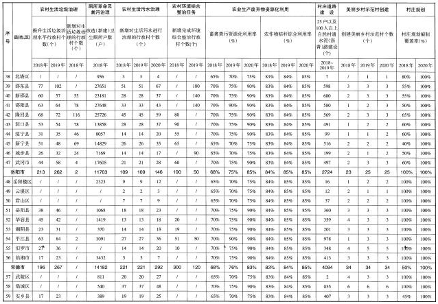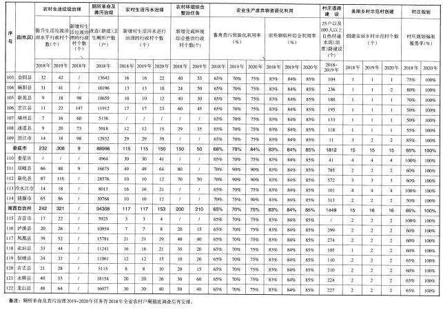 (五)著力提升村容村貌。實(shí)施“農(nóng)村公共空間整治工程”,整治集鎮(zhèn)亂搭亂建、占道經(jīng)營等現(xiàn)象,整治村莊公共空間和庭院環(huán)境,及時(shí)清理私搭亂建、亂堆亂放,開展“空心房”整治,拆除殘?jiān)珨啾冢瑥?fù)耕復(fù)綠,堅(jiān)持“一戶一宅”“建新拆舊”。鼓勵創(chuàng)新,依托互聯(lián)網(wǎng)和專業(yè)化公司,探索農(nóng)戶閑置房屋多元化利用。加快推進(jìn)通村組道路建設(shè),完成3.3萬個(gè)25戶以及100人以上的自然村通水泥(瀝青)路建設(shè)任務(wù)。充分利用本地資源,因地制宜選擇路面材料,加快推進(jìn)入戶道路建設(shè)。實(shí)施“湖湘農(nóng)民新居工程”,提升農(nóng)村建筑風(fēng)貌,推動建設(shè)具有地域特點(diǎn)、民族特色和時(shí)代特征的農(nóng)村建筑。實(shí)施“傳統(tǒng)村落保護(hù)工程”,傳統(tǒng)村落、民居保護(hù)機(jī)制全面形成,歷史文化名鎮(zhèn)名村得到有效保護(hù)。實(shí)施“農(nóng)村美化綠化氣化工程”,引導(dǎo)各地選用本地鄉(xiāng)土樹種,在村莊周邊、庭院宅旁、村內(nèi)道路河渠兩側(cè)栽植樹木,村莊綠化覆蓋率達(dá)到30%以上,70%以上村莊達(dá)到綠色村莊標(biāo)準(zhǔn)。對村莊古樹名木掛牌建檔,挖掘和發(fā)揮古樹名木的歷史文化和景觀價(jià)值。積極引導(dǎo)和推動在村莊主要出入口、主干道和公共活動空間合理設(shè)置路燈。開展城鄉(xiāng)環(huán)境衛(wèi)生整潔行動,推進(jìn)衛(wèi)生縣城、衛(wèi)生鄉(xiāng)鎮(zhèn)等衛(wèi)生創(chuàng)建活動。深入推進(jìn)“百城千鎮(zhèn)萬村”新農(nóng)村建設(shè)工程,重點(diǎn)開展美麗鄉(xiāng)村示范村創(chuàng)建和縣鄉(xiāng)全域推進(jìn)試點(diǎn)工作。持續(xù)推進(jìn)農(nóng)村環(huán)境綜合整治全省域覆蓋工作。2018年,完成1.8萬個(gè)自然村道路建設(shè),完成3000個(gè)村的農(nóng)村環(huán)境綜合整治任務(wù)。2019年,完成1.5萬個(gè)自然村道路建設(shè),完成2000個(gè)村的農(nóng)村環(huán)境綜合整治任務(wù)。2020年,全面完成農(nóng)村環(huán)境綜合整治全省域覆蓋工作任務(wù)。
