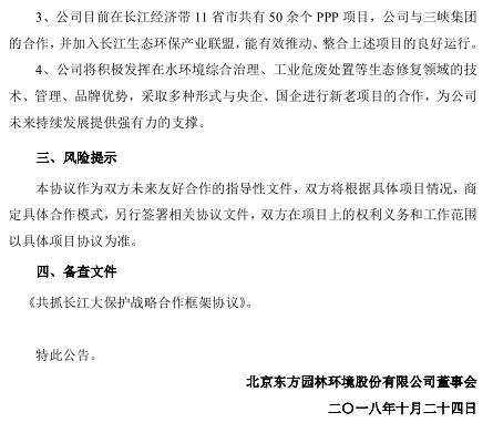 10月24日,東方園林公告,公司與長(zhǎng)江三峽集團(tuán)簽訂《共抓長(zhǎng)江大保護(hù)戰(zhàn)略合作框架協(xié)議》,雙方將通過多種合作模式,推動(dòng)長(zhǎng)江經(jīng)濟(jì)帶綠色產(chǎn)業(yè)經(jīng)濟(jì)運(yùn)營(yíng)合作;目前東方園林在長(zhǎng)江經(jīng)濟(jì)帶11省市共有50余個(gè)PPP項(xiàng)目,與三峽集團(tuán)合作,并加入長(zhǎng)江生態(tài)環(huán)保產(chǎn)業(yè)聯(lián)盟,能有效推動(dòng)這些項(xiàng)目的良好運(yùn)行。
